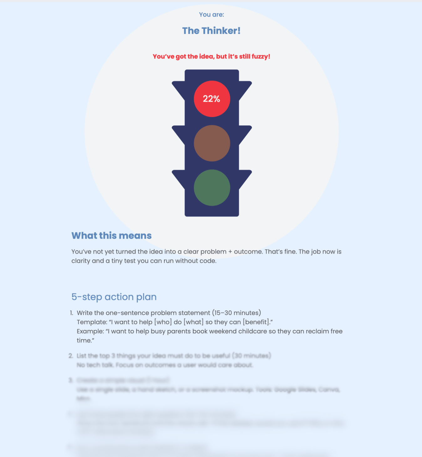 Our assessment is the first step to making these outcomes possible. By understanding exactly where you stand and what to do next, you'll be on the fastest path to launching your idea and achieving your bigger goals.